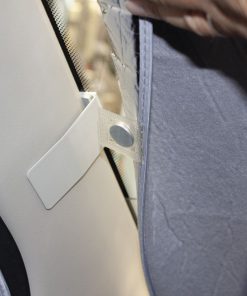 Die unkomplizierte Befestigung erfolgt mittels Magneten. Für die seitliche Befestigung des Frontteils werden beigelegte Winkel hinter den A-Säulen eingeschoben und mit den rückseitig an der Matte angenähten Magneten verbunden. Die an der Oberkante der Matte angebrachte Lasche wird über die Sonnenblenden gehängt und festgeklemmt.