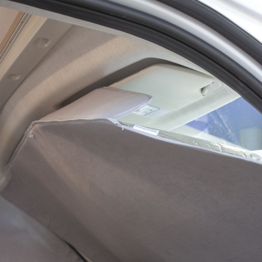 Die Seitenteile für Fahrzeuge mit eingebauter Innenverdunkelung (MV) werden zwischen der Rahmenkonstruktion der Verdunkelung und der Scheibe eingesteckt. Sie schließen ringsum ab.