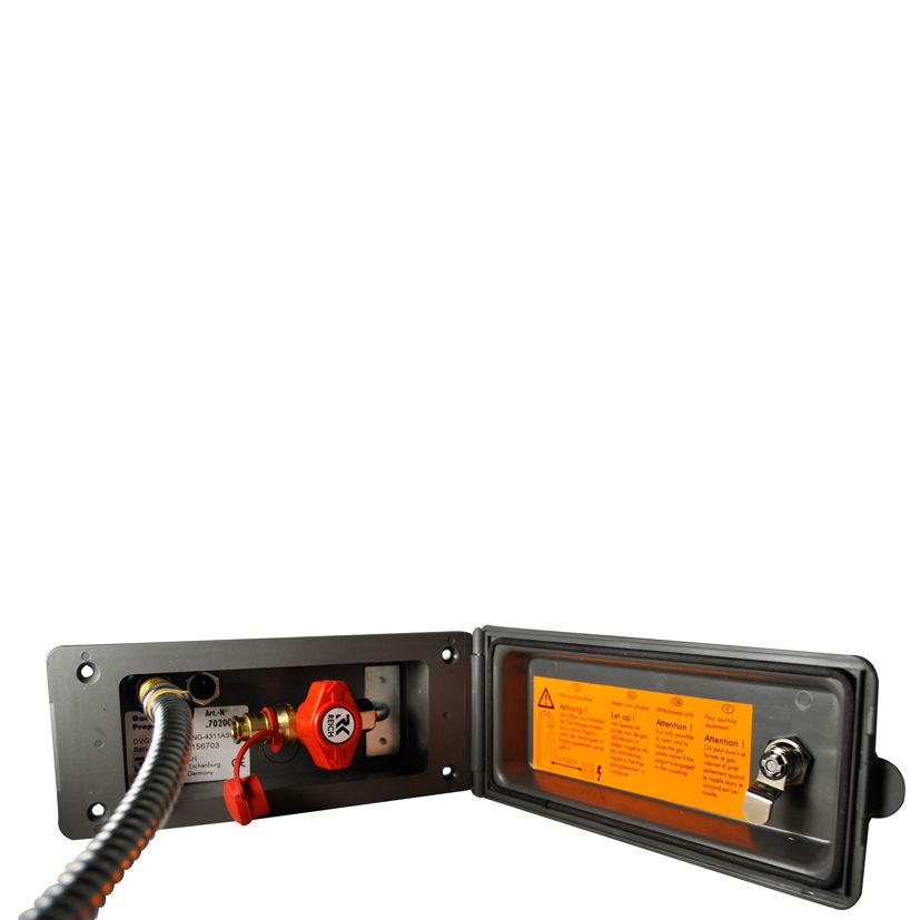 Mit je 1 Steckdose für Gas- und Wasserentnahme im Freien. Nach Abziehen des jeweiligen Schlauches (Gasschlauch und Dusche gehören bei diesem Modell nicht zum Lieferumfang) wird die Entnahme automatisch gestoppt. Mit Gas-Absperrventil, Schloss und Schlüssel ausgestattet. Einbaumaß: 157 x 67 mm.