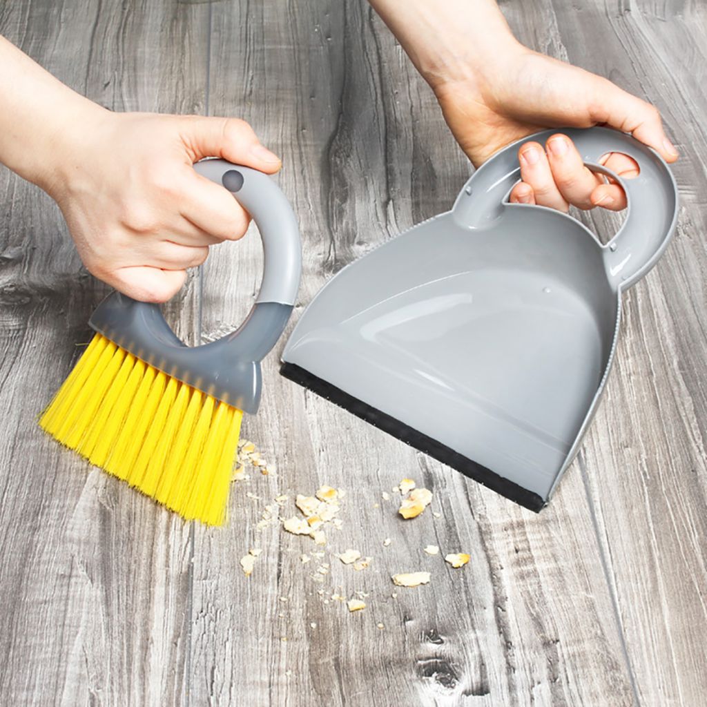Modernes Mini-Kehrset bestehend aus Handfeger und Kehrschaufel. Platzsparend verstaubar.