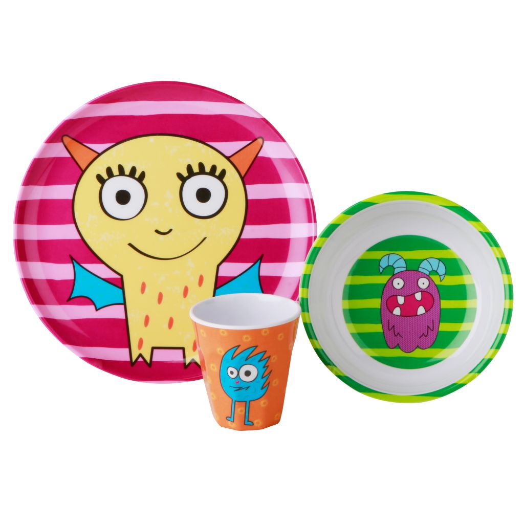 Kindgerechtes Essgeschirr im farbenfrohem Design, besteht aus 3 Teilen: