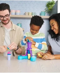 Kinetic Sand fliesst dank seiner magischen Textur durch die Hände. Diese Eigenschaft kommt mit der Softeis Station bestens zur Geltung. Einfach den Sand oben einfüllen und fliesst er im typischen Softeis-Look in den Waffelbecher. Die verschiedenen Eissorten können in den Behältern der Station aufbewahrt werden.