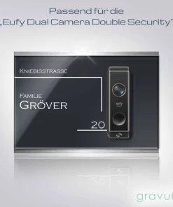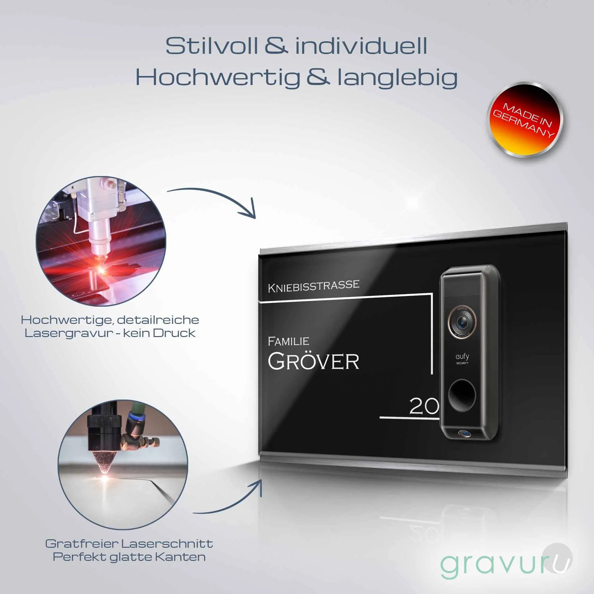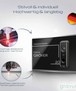Die Funkklingelschilder aus Edelstahl & Acrylglas werden in unserer hauseigenen Produktionsstätte nach Industriestandard lasergeschnitten und graviert. Die Klingelplatte besticht nicht nur mit ihrer Optik, sondern auch mit ihrer Witterungsbeständigkeit – sie ist beständig, rostet nicht und trotzt Wind und Wetter.