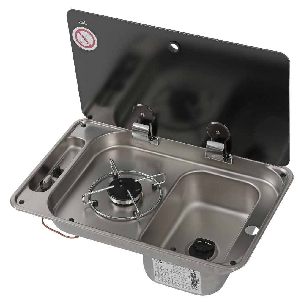 Einbau-Kochmulde mit Abdeckung aus gehärtetem Sicherheitsglas. Mit elektronischer Zündung (Anschlussspannung 12 Volt wird benötigt) und Sicherheitszündsystem; inklusive Dichtung; Anschlussdruck 30 mbar, Leistung 1 x 1 kW, 2 x 1,9 kW, Verbrauch 1 x 73 g/h, 2 x 127 g/h. Einbautiefe 11 cm, Einbaumaße 69,6 x 32,4 cm, Außenmaße 71,6 x 34 cm, Gewicht 5,8 kg.