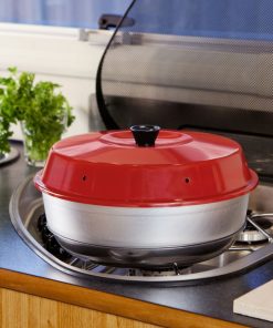 Mit glasbeschichteter Stahloberfläche und elektrischer Zündung.