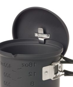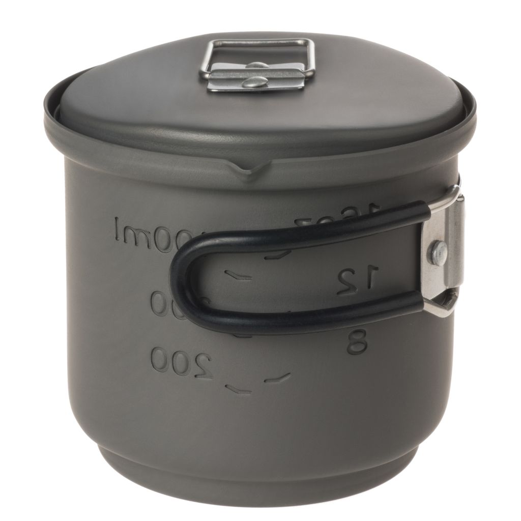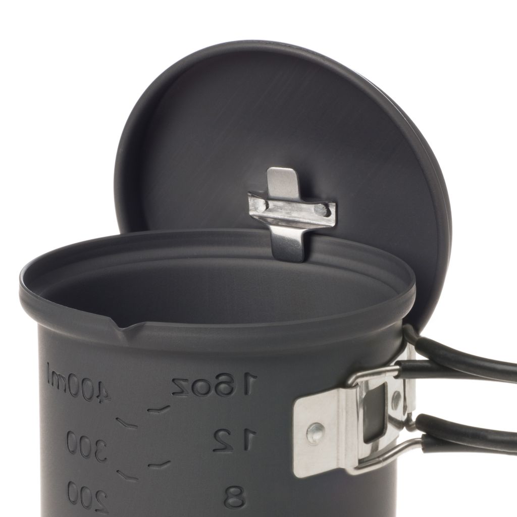 Wenn Gewicht eine Rolle spielt, ist dieses Kochset die richtige Wahl. Etwa 200 g leicht, aus hart anodisiertem Aluminium und mit Esbit Trockenbrennstoff ganz einfach zu befeuern. Der Topf fasst ca. 585 ml, zum Lieferumfang gehören auch der Deckel sowie ein Stand, der sich platzsparend im Topf verstauen lässt. Der Topf hat eine Volumenanzeige in Oz und Liter, die Edelstahlgriffe sind platzsparend klappbar. Mit praktischem Netzbeutel.