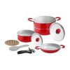Set S bestehend aus: 1 Kochtopf (ø 18 cm), 1 Kochtopf (ø 22 cm), je 1 Deckel (ø 18 und ø 22 cm), 1 Pfanne (ø 20 cm), 1 Pfanne (ø 22 cm), 1 Sieb und 1 Handgriff