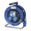 Kabeltrommel mit 25 m Kabel H07-RN-F 3G1,5mm². Mit 3 Schutzkontaktdosen, Klappdeckel mit Thermoschutzschalter zur Verwendung im Freien.