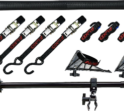 Anbaumaterial, Auffahrschiene, Haltebügel mit Scheuerschutz, 3 Spanngurte, 2 Keile.
