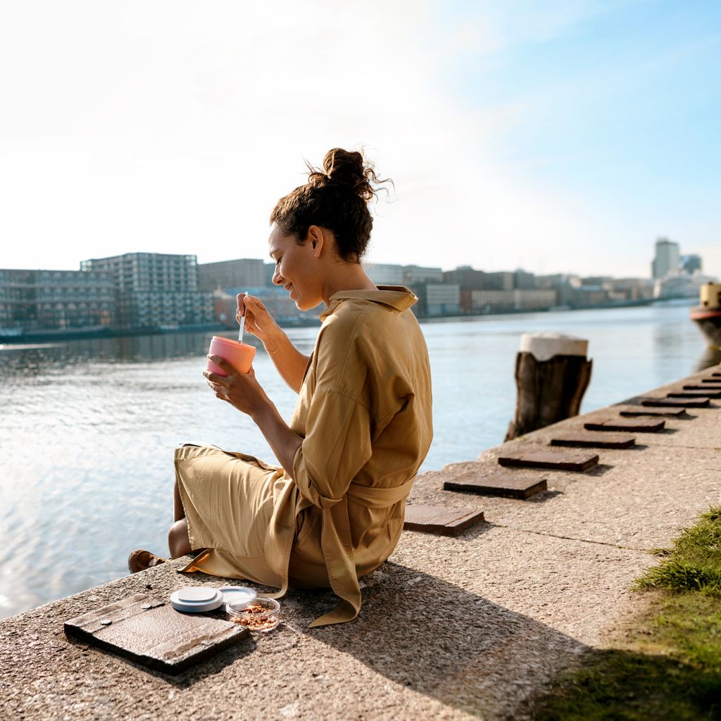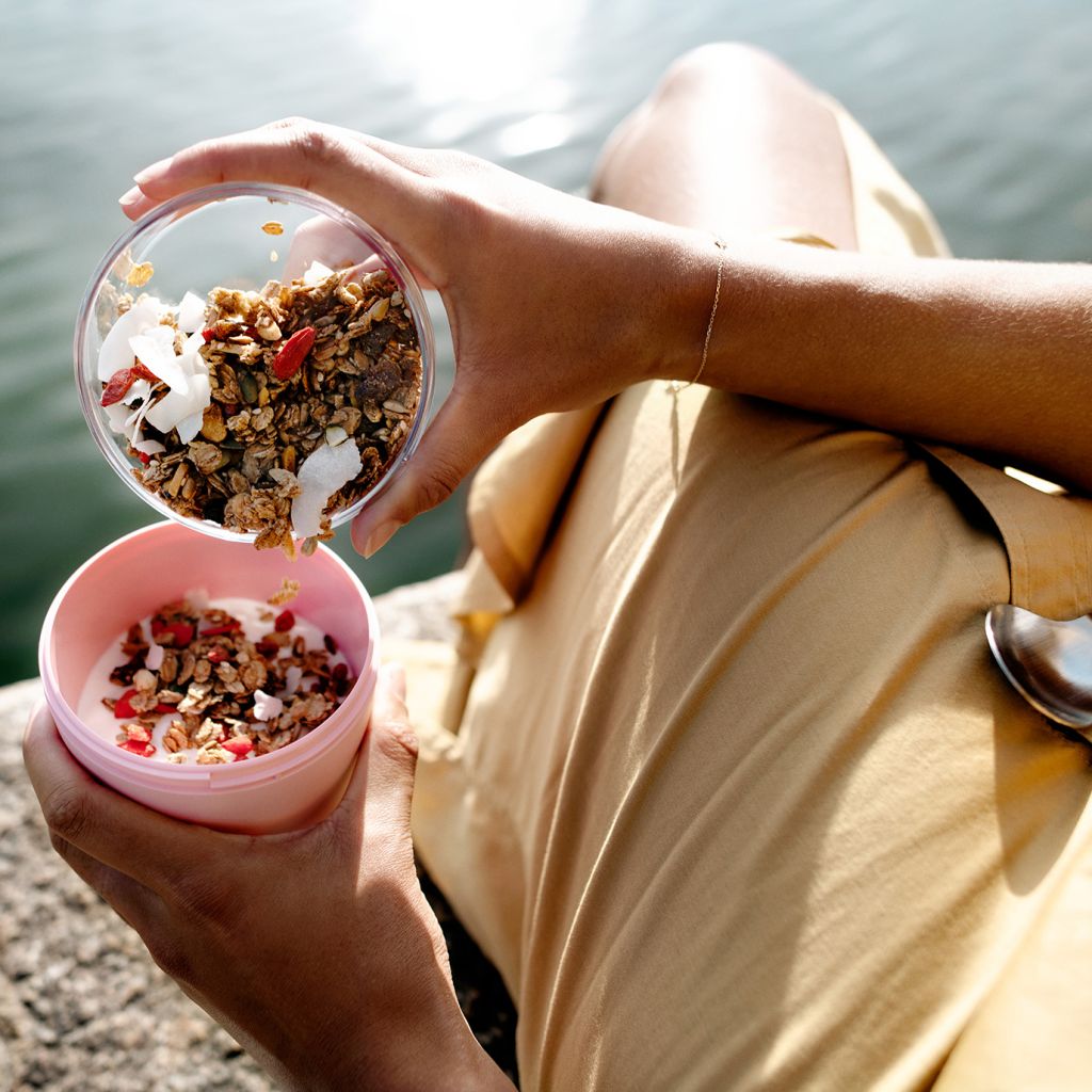 Der Ellipse Lunchpot von Mepal ist eine praktische Transportmöglichkeit, um einen kleinen Snack oder eine Zwischenmahlzeit mitzunehmen. Mit zwei verschiedenen Behältern, in denen sich die Zutaten getrennt voneinander aufbewahren und transportieren lassen. So wird aus dem Mepal Lunchpot ganz einfach ein praktischer Suppenbecher, Joghurtbecher oder Müslibecher to go. Der Inhalt des oberen, transparenten Behälters beträgt 200 ml, der Inhalt des unteren Behälters 500 ml.