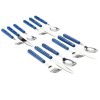 3-teiliges antihaft-beschichtetes Messerset inkl. Schneidebrett, bestehend aus Schälmesser (8,5 cm), Brotmesser (19,5 cm) und Allzweckküchenmesser (Santokumesser 16,5 cm). Alle Messer haben einen Klingenschutz und einen Anti-Rutsch-Griff. Das Schneidebrett (37 x 23 cm) besteht aus PP und MDF. Material Messergriff: PP & TPR, Messerklinge: Edelstahl mit Antihaftbeschichtung.
