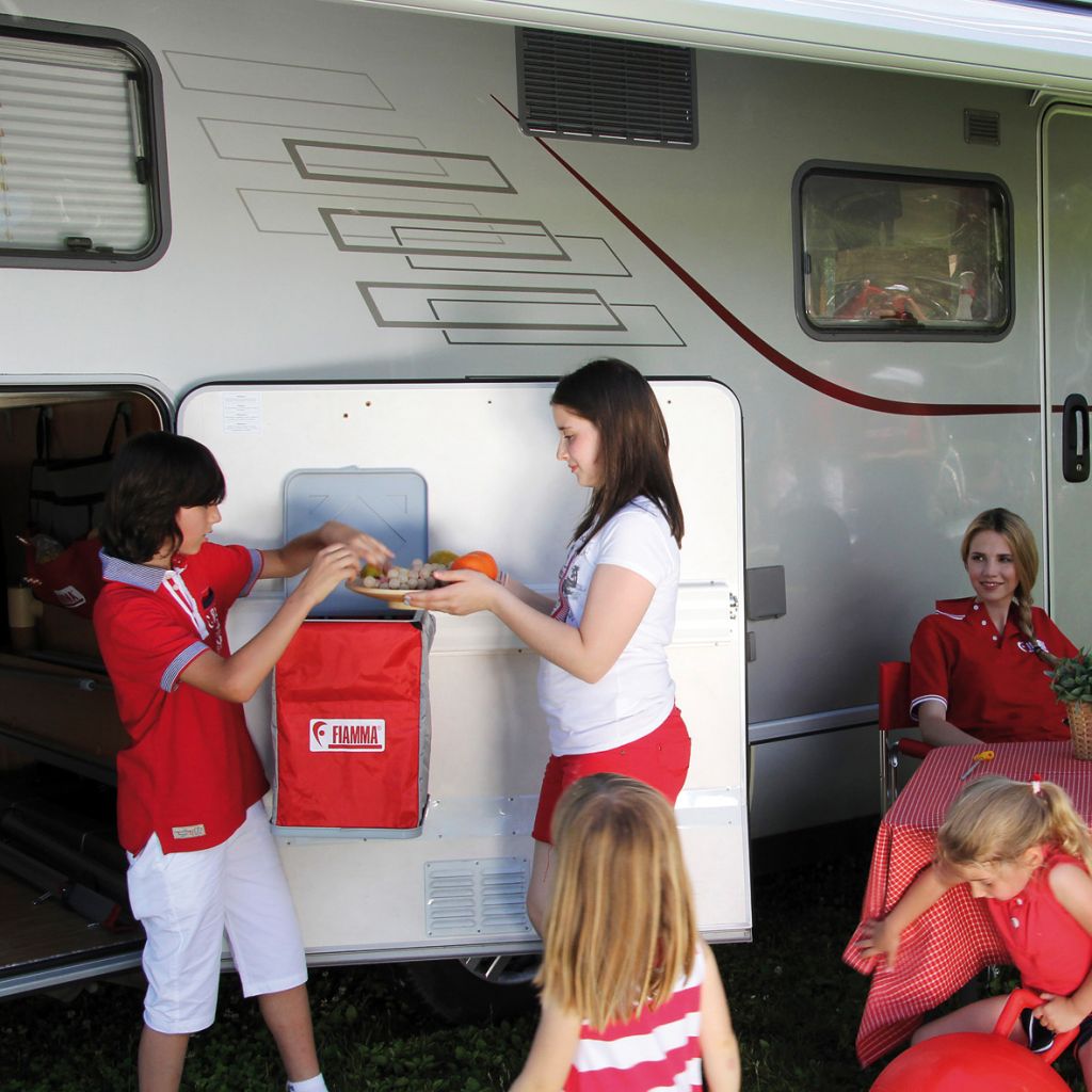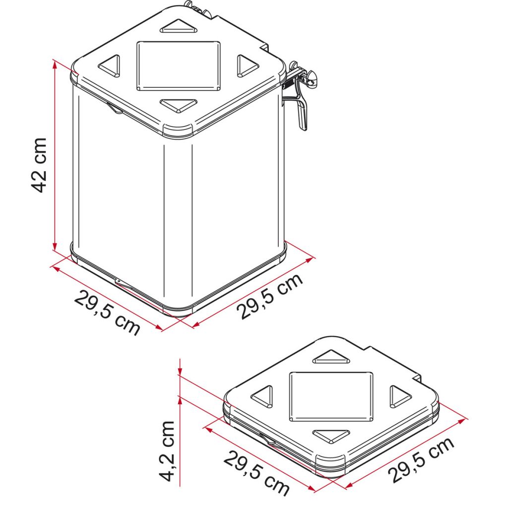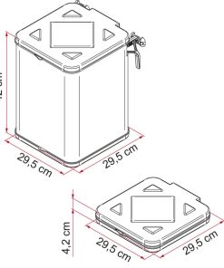 Klappbarer Müllbehälter, welcher beliebig eingesetzt und positioniert werden kann. Leicht im Gebrauch, lässt sich durch die serienmäßig mitgelieferten Haken aufhängen. Geschlossen nimmt er nur wenig Platz ein, geöffnet ist er sehr geräumig, 35 l Plastik-Mülltüten können verwendet werden, Deckel und Boden sind aus solidem Kunststoff hergestellt. Der Behälter selbst ist aus undurchlässigem und UV-beständigem Polyesterresinat.