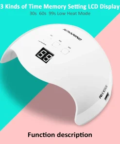 • 3 Timer-Modi (Low Thermal Mode) ★ Das Nagellicht verfügt über drei Tasten 30s / 60s / 99s, um die Trocknungszeit auszuwählen, die dem ausgewählten Nagellack am besten entspricht. Die Leistung der 99s (Low Heat Mode) steigt mit der Zeit allmählich an, um alle durch das erstarrte Gel verursachten Schmerzprobleme zu beseitigen