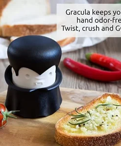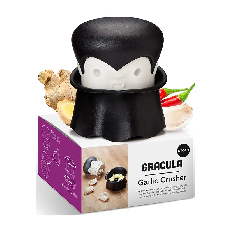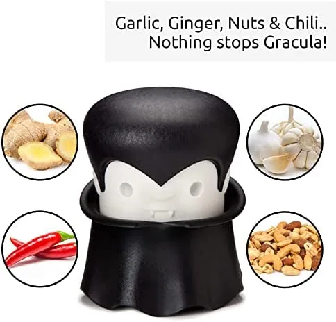 - Jede Sekunde zählt – Hast du Knoblauch, der zubereitet werden muss? Kein Problem! Gracula ist einsatzbereit. Keine Sorge, Graf Gracula ist da, um die Essenszubereitung mit einer Prise Spass zu beschleunigen! Die langweiligen Stunden in der Küche sind dank dem immer einsatzbereiten Gracula vorbei. Die vom preisgekrönten OTOTO Studio entworfene, hübsche Knoblauchpresse ist nicht nur ein Lebensretter, sondern auch ein auffälliges Küchenelement.