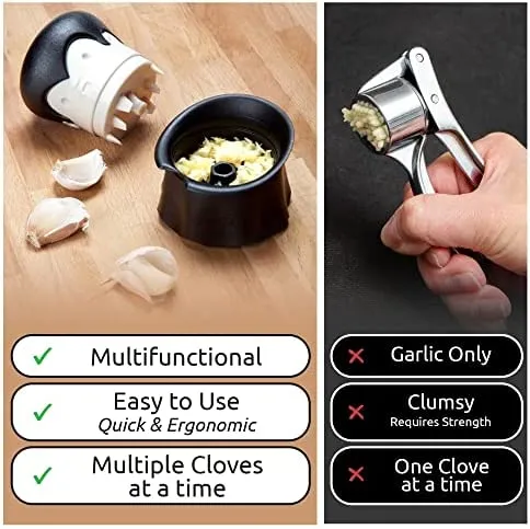 - Drehen, zerdrücken und fertig: Der Mini-Zerkleinerer macht die Zubereitung von Mahlzeiten einfach und schnell. Alles, was du tun musst, ist drücken, pressen und hacken, um alles unter Kontrolle zu bekommen. Gracula ist dank einer manuellen Presse, nicht nur nützlich für Knoblauch, sondern auch funktionell für andere Zutaten! Dank Graf Gracula kannst du soviel wie möglich hacken. Knoblauch schälen, Nüsse zerdrücken, Ingwer, Kräuter und viele andere Gewürze zerkleinern!