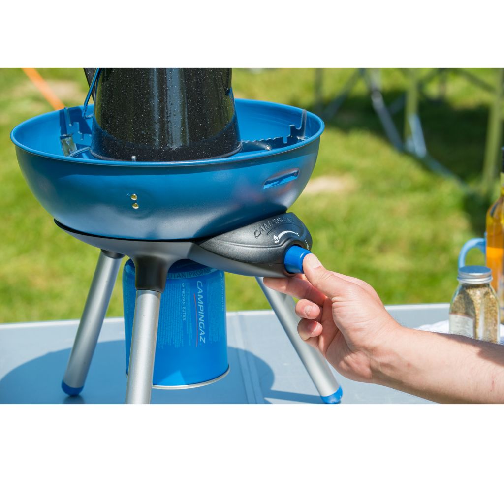 Party Grill® 200 CV mit Piezozündung und Easy Clic®-Anschluss für Ventilkartuschen CV 300 Plus und CV 470 Plus. Lieferumfang: Topfkreuz, Grillrost und Transportdeckel.