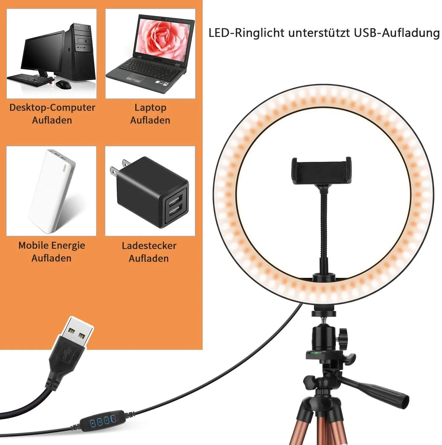 Die Leuchte kann an jedes Gerät angeschlossen werden, das über einen USB-Anschluss verfügt. Sie eignet sich hervorragend für Ihr Ladegerät, Ihren Laptop, Ihren Computer und Ihre Powerbank.
