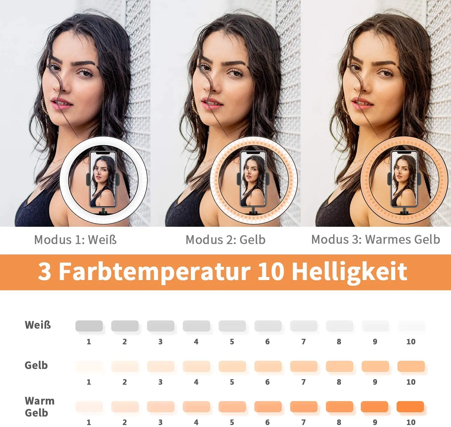 Drei Beleuchtungsmodi: warmes Gelb, kaltes Weiss, warmes Weiss.