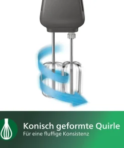 - Der konisch geformte Quirl sorgt dafür, dass viel Luft unter den Teig gehoben wird und somit ein luftiger, glatter Kuchenteig entsteht. Der Handmixer lässt sich nach Gebrauch schnell reinigen: die Quirle und Knethaken sind spülmaschinenfest und dank der glatten Unterseite kann das Gerät ganz einfach mit einem feuchten Lappen abgewischt werden.