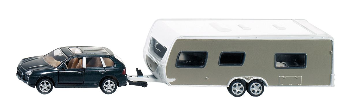 Ein PKW zusammen mit einem Wohnwagen, dem Dethleffs „Exclusiv Emotion“ und ausreichend Zubehör aus der SIKU SUPER Serie. Besonders ist vor Allem das abnehmbare Dach des Wohnwagen. Das ermöglicht auch das Spielen mit den mitgelieferten Figuren innerhalb des Wohnwagens. Außerdem sind neben den Figuren 2 Gartenstühle, ein runder Tisch, ein Sonnenschirm, eine Gartenliege und ein kleiner Grill mit dabei.