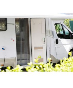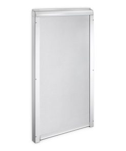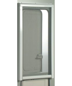 Die Insektenschutztür hat einen weißen, dekorativen Aluminiumrahmen und passt sich exakt in die Formgebung des Interieurs ein. Die Tür lässt sich an der Griffleiste stufenlos öffnen und schließen. Sie wird sicher und leichtgängig in den robusten Laufschienen geführt.