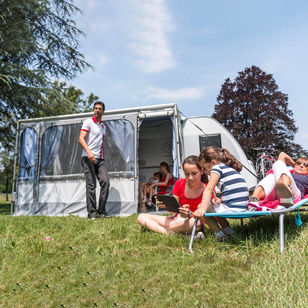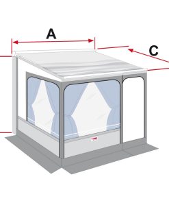 Lieferumfang: 1 Frontseite mit aufrollbarem Fenster, Moskitonetz und Tür, welche sowohl rechts als auch links angebracht werden kann. 2 Seitenwände mit aufrollbaren Fenstern und Moskitonetz, Befestigungssystem Fast-Clip, Mega Bag.