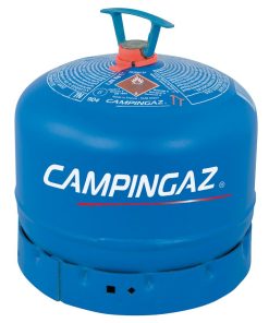 Gasflasche mit Ventil und Schutzkappe, amtl. geprüft, leer; mit Schutzmantel, für Propan/Butan-Füllung.