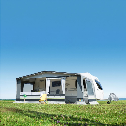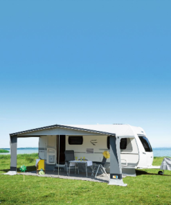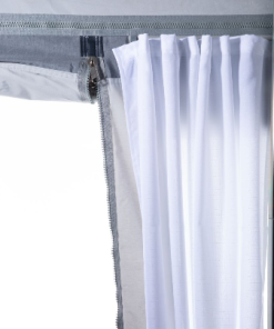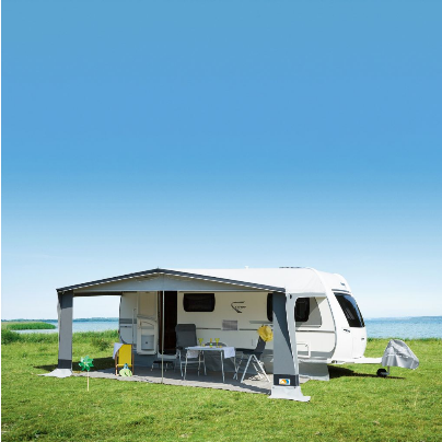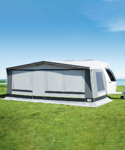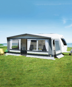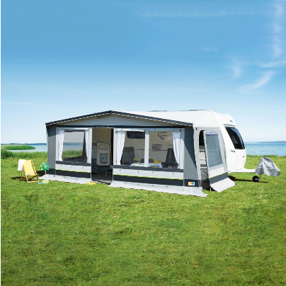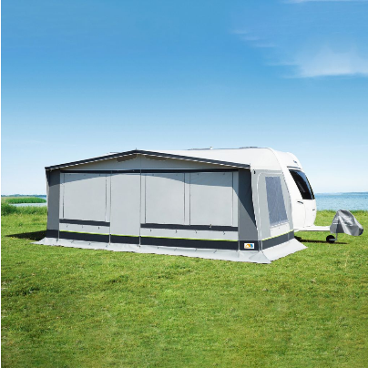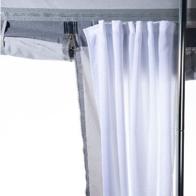 Seitenwände mit großen Gazefenstern. Gazefenster durch Prägefolienklappe mittels Reißverschluss verschließbar. In beiden Seitenwänden eine seitlich wegrollbare Eingangstür. Rechte Seitenwand mit doppelter Windecke (vorteilhaft für aerodynamische Caravans).