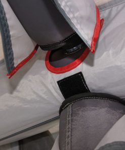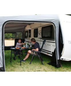 Vorderwand mit Panoramafenster sorgt für viel Licht im Vorzelt. Die Fenster mit Moskitonetzeinsatz können jeweils als Tür genutzt oder komplett aufgerollt werden, sodass das Vorzelt als Veranda nutzbar ist.