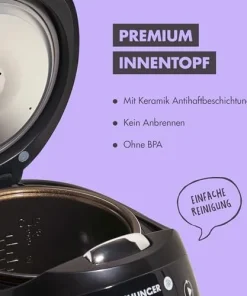 Der hochwertige, keramikbeschichtete Innentopf sorgt durch seinen 3-schichtigen Aufbau für eine gleichmässige Hitzeverteilung.
