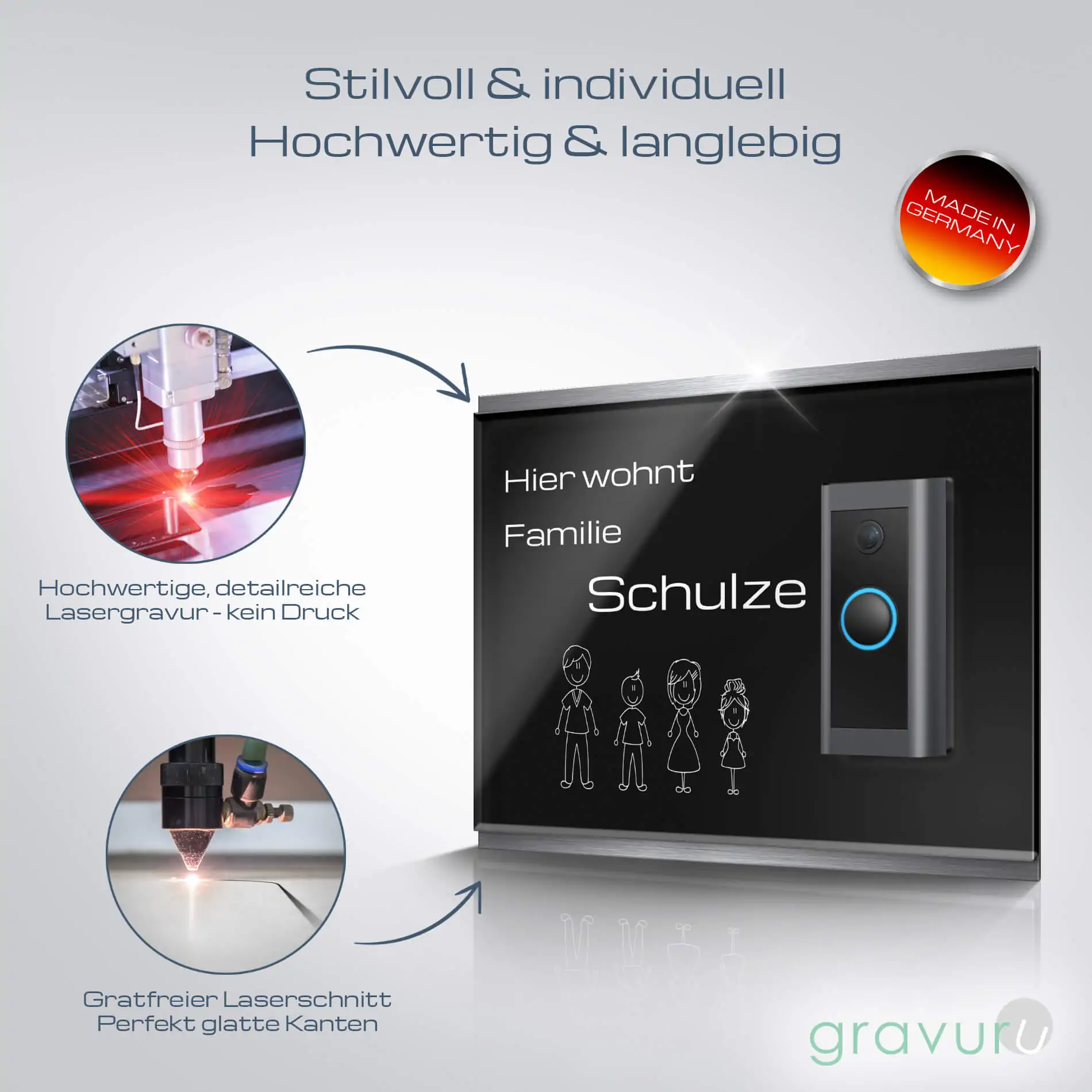 Die Funkklingelschilder aus Edelstahl & Acrylglas werden in unserer hauseigenen Produktionsstätte nach Industriestandard lasergeschnitten und graviert. Die Klingelplatte besticht nicht nur mit ihrer Optik, sondern auch mit ihrer Witterungsbeständigkeit – sie ist beständig, rostet nicht und trotzt Wind und Wetter.