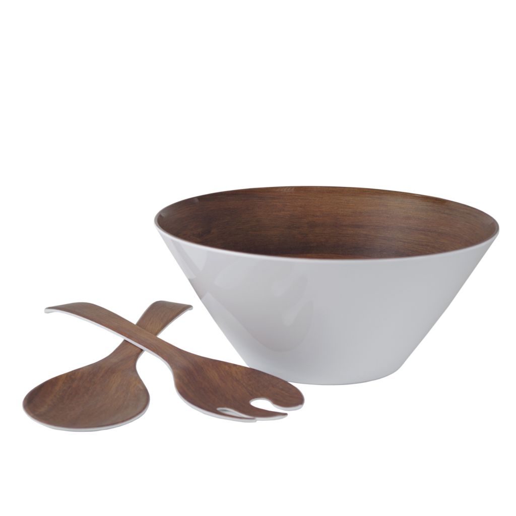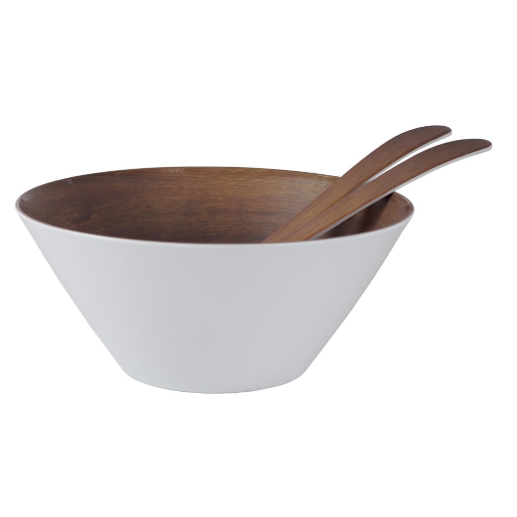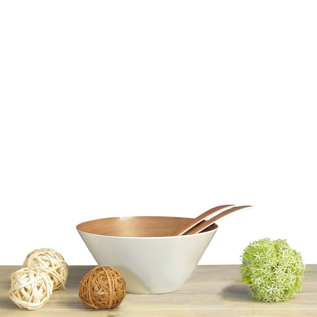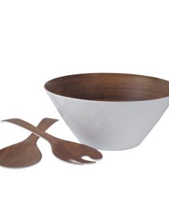 Die Salatschüssel mit edler Holzoptik auf der Innenseite und weiß an der Außenseite besticht durch schöne Eleganz. Ebenso weist das mitgelieferte Besteck diese ansprechende Holzoptik auf. Formschön und praktisch wird sie für jeden Esstisch zum Mittelpunkt. Die leichte, kratzfeste und stoßfeste Schüssel ist aus 100% Melamin.