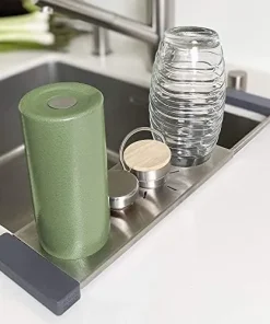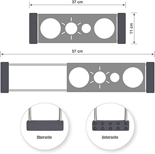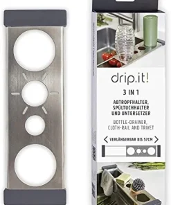 Passend für 3 Flaschen. Mit schützenden (und abnehmbaren) Silikonringen und extra Ablagefläche für Flaschendeckel oder anderes. Multifunktional auch als Untersetzer oder Spültuchhalter (Edelstahlplatte abnehmbar). Teleskopische Schienen lassen sich stufenlos ausziehen, und passen so über fast jede Spüle. Und: Flaschen tropfen direkt über der Spüle ab, keine nassen Arbeitsflächen!