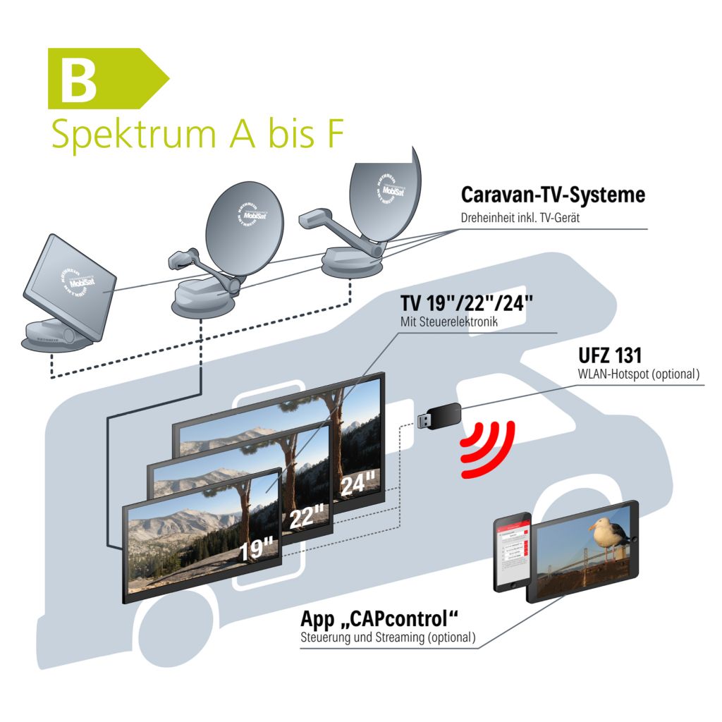 Kathrein bietet 3 unterschiedliche vollautomatische Sat-Systeme, die in Kombination mit der entsprechenden Steuerungslösung und weiterem Zubehör alle Konfigurationswünsche zufriedenstellen. Von der HDP 850 mit großer Dreheinheit mit sehr gutem Empfang, sogar in den Randbereichen, über die kompakte HDP 750, für den gänigen Einsatz in Mitteleuropa, bis zur platzsparenden Flachantenne HDP 750 arbeiten alle Systeme mit dem wegweisenden CAP-Konverter, der einen Receiver überflüssig macht und in Verbindung mit Kombination mit dem WLAN-USB-Adapter UFZ 131 (Art-Nr. 71 462) das Streamen von Fernsehübertragungen erlaubt. Noch eleganter ist die Kombi-Lösung: Die Anlagen HDP 650 und 850 GPS können mit einem alphatronics-Flachfernseher, der anstatt des CAP-Konverters die Steuerung übernimmt, betrieben werden.
