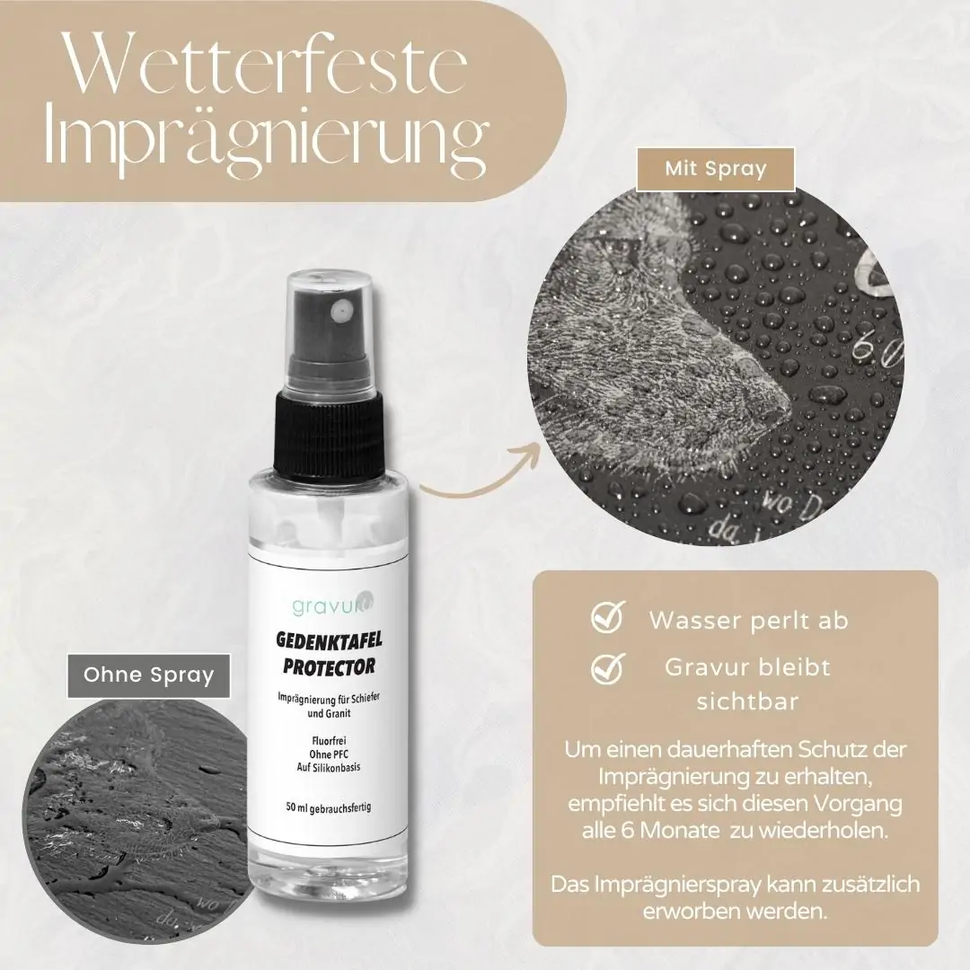 Aufgrund des Natursteins ist es normal, dass sich bei einer Schiefer Grab Platte die Gravur bei Nässe verdunkelt und nicht mehr optimal sichtbar ist. Sobald die Gedenkplatte getrocknet ist, kommt die Gravur aber wieder rückstandslos zum Vorschein. Die Gedenktafel sollte zudem immer mit einer leichten Neigung aufgestellt werden, damit sich auf der Platte kein Wasser stauen, sondern abfließen kann.