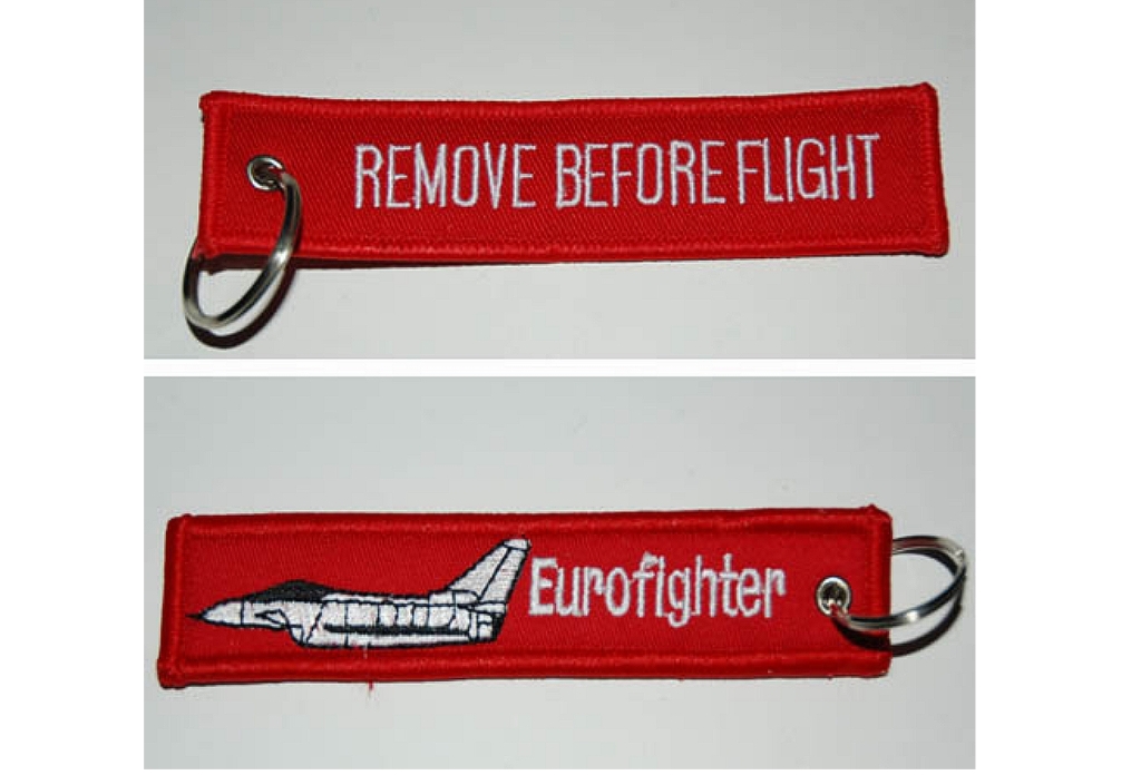 Roter Schlüsselanhänger mit weißem Stick Eurofighter, schwarz/weißem Stick Kampfflugzeug und auf der Rückseite mit weißem Stick Remove before Flight.