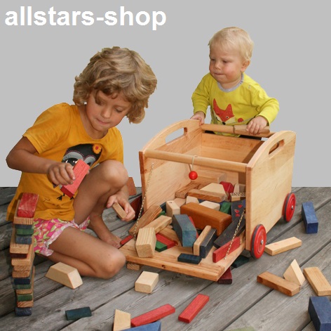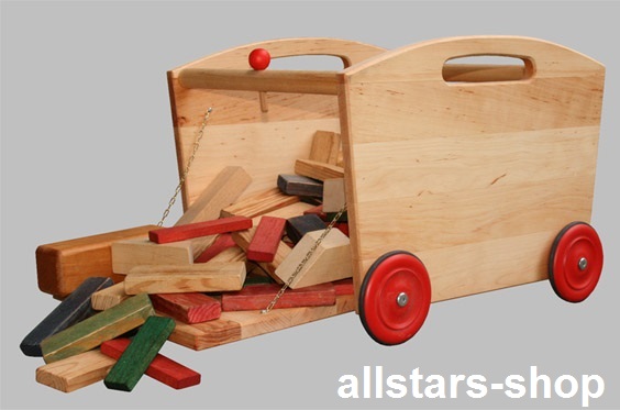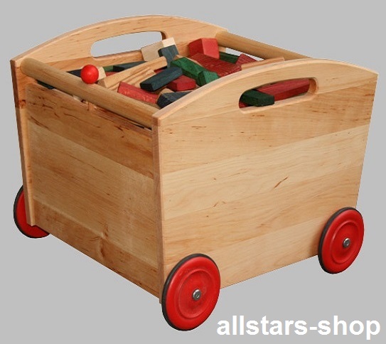Dieser Spielzeug-Aufräumwagen für Holz-Bauklötze ist ideal zum Ordnung schaffen,