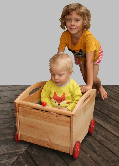 Dieser Spielzeugwagen ist ideal zum Verstauen von Bauklötzen, Puppen und anderem Spielzeug. Durch Verriegeln der Klappe sind die Spielsachen wunderbar aufgeräumt. An den beiden Griffstangen lässt er sich gut schließen. Der Wagen besteht aus massiver, geölter Erle.