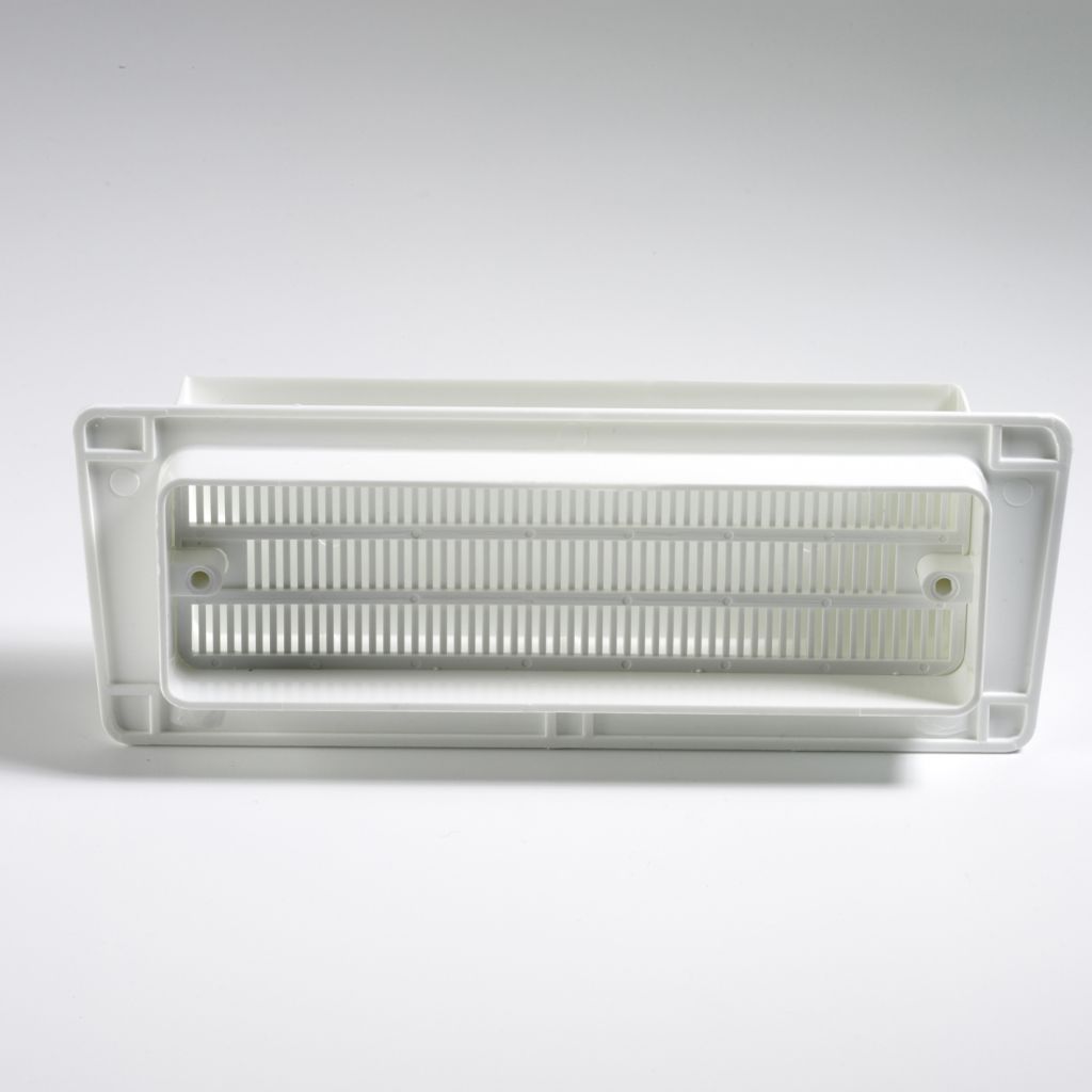 Aus witterungsbeständigem Kunststoff mit Fliegengitter. Farbe: signalweiß RAL 9003, Innenteil mit Lüftungsschieber. Außenmaß: 205 x 75 mm, Wandausschnitt: 172 x 52 mm, Wandstärke: ab 23 mm.
