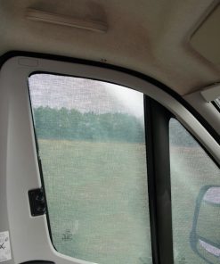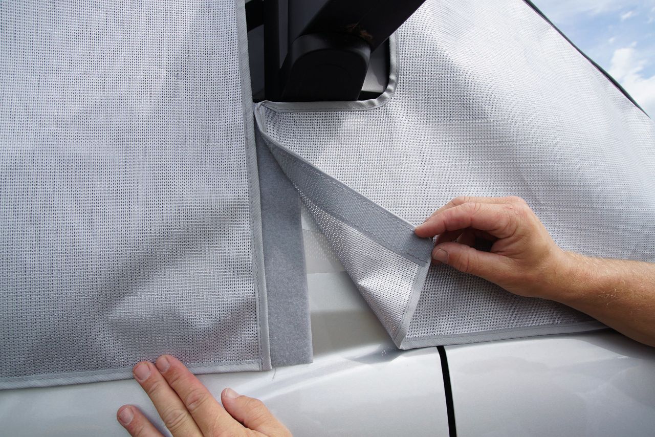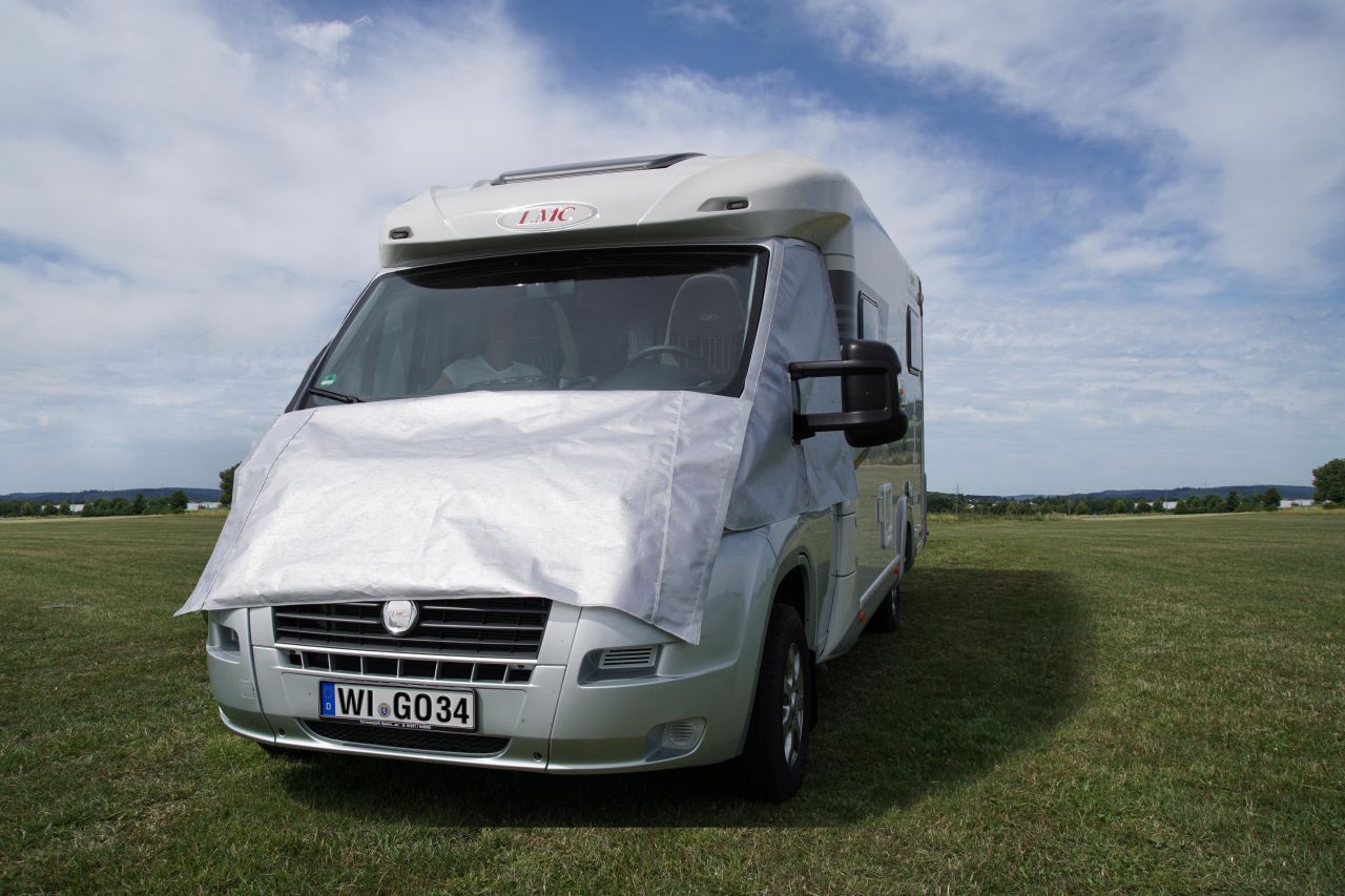 Passgenau gearbeitete Sonnenschutzmatte, geeignet für Kastenwagen, teilintegrierte und Alkoven-Fahrzeuge. Hergestellt aus silbernem Mesh-Gewebe sorgt sie bei heißen Temperaturen für ein angenehmes Klima im Fahrerhaus und schützt zugleich vor neugierigen Blicken von außen ohne dabei den Blick von innen stark zu beeinträchtigen. Die Montage ist schnell und einfach und erfolgt über Taschen, die in die Seitentüren eingehängt werden. Breite ca. 420 cm, Höhe ca. 170 cm.