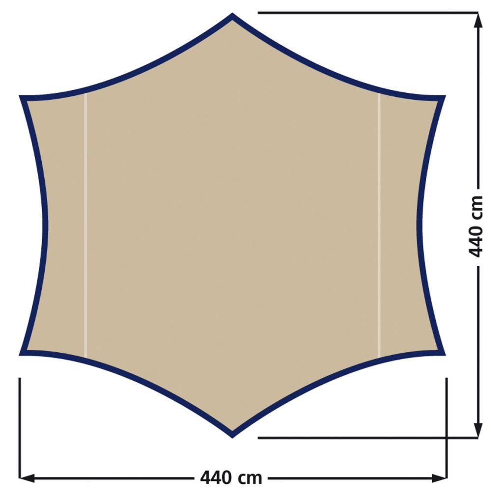 Schönes Sonnensegel in Form eines Hexagons. Schnell aufgebaut, egal ob am Strand oder im Garten. Inklusive ø 18 mm Stahlgestänge, Abspannleinen und Heringe. Material: Polyester 185T.