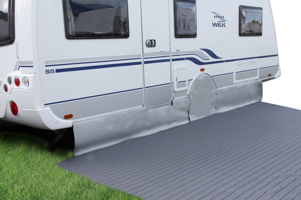 Speziell für Caravans mit abgesenktem Türeinstieg entwickelt. Ein zusätzlich im Lieferumfang enthaltenes Kederstück wird unterhalb des Einstiegs eingezogen und mittels des an der Rückseite der Bodenschürze angebrachten Klettbandes fixiert. Anschließend muss das die Tür überlappende Stück der Bodenschürze nur noch per Hand herausgeschnitten werden. Hergestellt aus winterfestem Planenmaterial mit angeschweißtem Textilkeder, Farbe hellgrau. Für Fendt Caravans ab Baujahr 2016 sind spezielle Ausführungen erhältlich. Geeignet in Kombination mit den fahrzeugspezifischen Radkastenabdeckungen.
