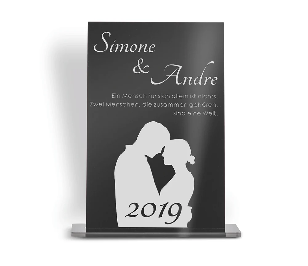 – Material: Hochglanz Acrylglas mit Gravur – Größe: ca. 15 x 23 cm – Stärke: 5 mm – inklusive Standfuß aus Acrylglas – Farben: Hochglanz Anthrazit, Hochglanz Schwarz, Hochglanz Klar, Satiniert