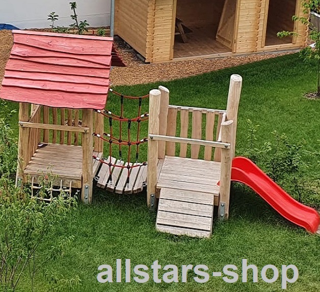 - 1 Stück Podestverlängerung (für Holzbrücke-Podest) als Auftritt auf dem bauseitig anzulegenden Hügel, Länge: ca. 40 cm, Breite: ca. 85 cm, sowie Pfosten für Hügeleintritt (Sonderanfertigung Mehrpreis anfrage)