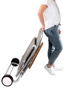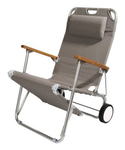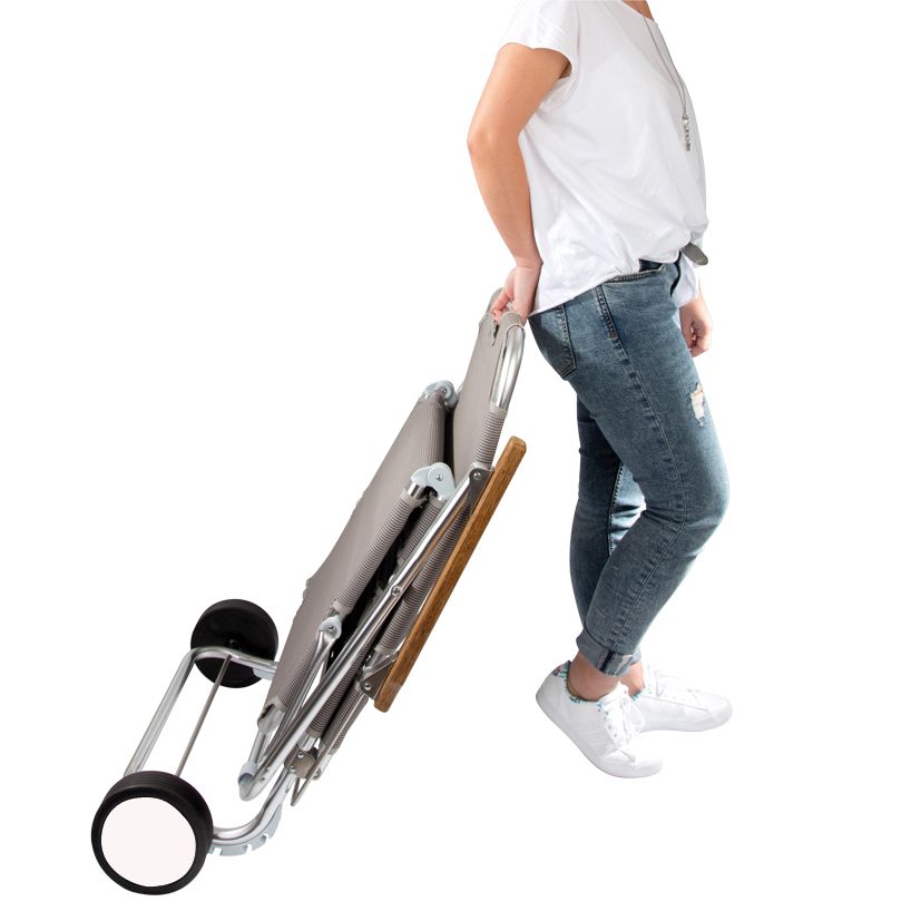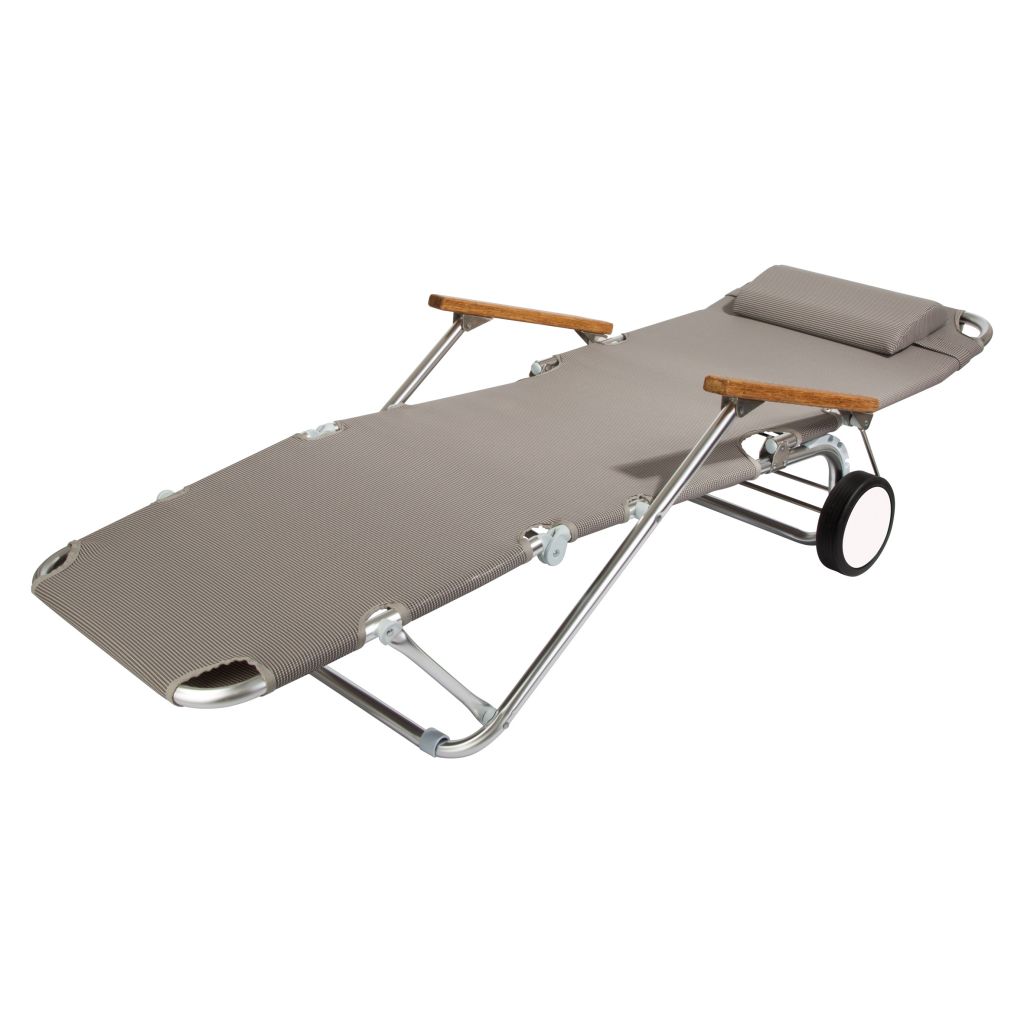 Universell einsetzbare Strandliege mit Transportmöglichkeit, die durch ihr leichtes Aluminiumgestell mit wetterfester, textilener Bespannung, Armlehnen aus Bambus und einfacher Verstellmöglichkeit die verschiedenen Nutzungsmöglichkeiten in einem Produkt vereint. Zusätzlich verfügt sie über rostfreie Edelstahlbeschläge.