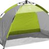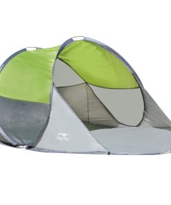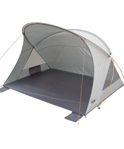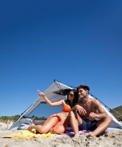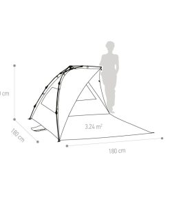 Strandschutz mit innovativem aerodynamischem Design. Sie bietet viel Platz für 2 bis 3 Personen. Bodenfläche: 3,20 m². 2-Stangensystem für schnelles Auf- oder Abbauen. Verbesserte Stabilität bei starkem Wind mit extra Befestigungsmöglichkeit für Schnüre. Lichtschutzfaktor UV 50+. 360° Rundsicht. Material: 210D PES Polyester mit 110T/PU Silberbeschichtung. Lieferumfang: Muschel, ø 9 mm GFK-Gestänge, Abspannmaterial und Tragetasche mit Reißverschluss.