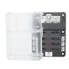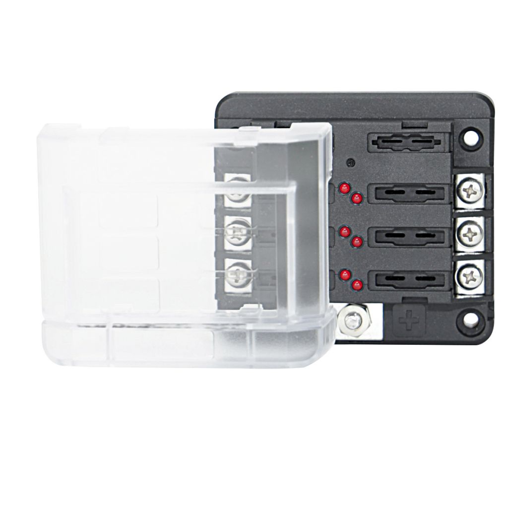Kompakter Plus-Stromverteiler mit 6 Plus Ausgängen (M4). Die Stromzuführung erfolgt über einen Zentraleingang (M5). Ist eine Sicherung defekt, wird dies durch eine LED angezeigt. Die jeweiligen Ausgänge sind bis 30 A belastbar. Die Gesamtbelastung beträgt 100 A. Lieferung ohne Sicherungen.