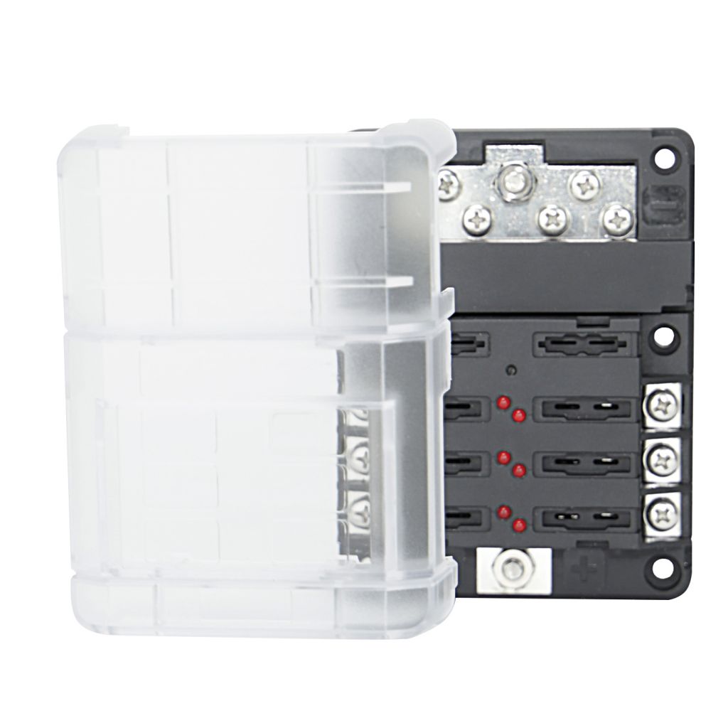 Kompakter Plus/Minus-Stromverteiler. Ausgerüstet mit 6 Plus-Ausgängen (M4) sowie einer Masseverteilung. Die Stromzuführung erfolgt über je einen Zentraleingang (M5). Ist eine Sicherung defekt, wird dies durch eine LED angezeigt. Lieferung ohne Sicherungen.