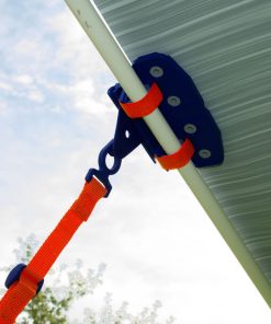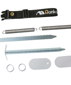 Herkömmliche, über dem Zelt liegende Sturmgurte können durch Scheuern das Dachgewebe beschädigen. Angenähte Sturmsicherungen belasten die Naht- und Gewebebereiche unnötig. Das Sturmsicherungspaket sichert das Vorzelt am Gestängedorn der Eckwinkel, einem der stabilsten Punkte eines Vorzeltes. Die Abspannung erfolgt mit schweren Gewebegurten und robusten Ankerheringen. Die Stahl-Spiralfeder gleicht durch Windböen hervorgerufene Reiß- und Zugkräfte aus.