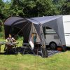 Die Vorderwand besitzt ein großes Klarfolienfenster und die eingenähten Gardinen schließen die Fenster von innen blickdicht.